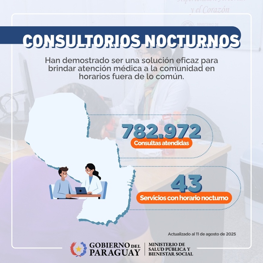 Desde su implementación, los consultorios nocturnos del Ministerio de Salud Pública han registrado 782.972 atenciones en 43 servicios de todo el país. Esta estrategia, que extiende el horario de atención de 16:00 a 22:00, facilita el acceso a consultas con especialistas y descongestiona las áreas de urgencia y también permite a los usuarios acceder a los servicios en las USF, en este caso, correspondientes a la VII Región Sanitaria – Itapúa.
