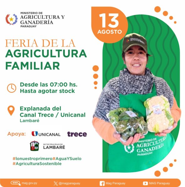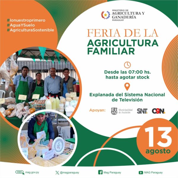 Bajo el lema “lo nuestro primero”, el Ministerio de Agricultura y Ganadería hará nuevamente posible la compra directa de los productos de la finca familiar, de la mano de sus cultivadores. Este miércoles 13 de agosto estarán en la explanada de los canales 13 y Unicanal, en Lambaré, y del SNT C9N, en Asunción. Así, la ciudadanía podrá acceder a precios justos y productos de gran calidad, contribuyendo con la agricultura sostenible y cuidadosa del medioambiente.