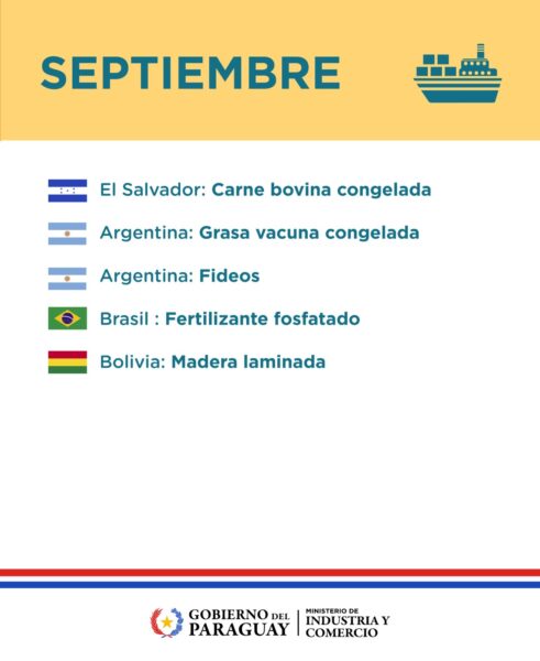 El mes de septiembre cerró el trimestre con nuevos destinos para carne bovina congelada a El Salvador por USD 145.155, fideos a Argentina por USD 165.655 y fertilizantes fosfatados a Brasil por USD 234.360, además de madera laminada a Bolivia y grasa vacuna a Argentina.