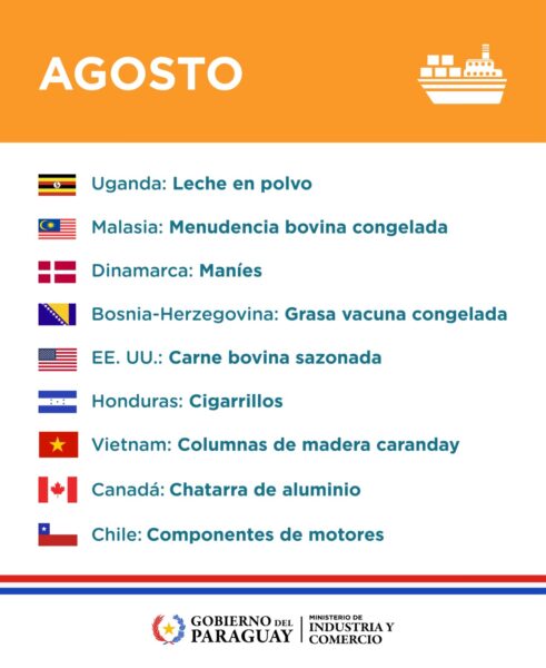 En agosto, las operaciones alcanzaron nuevos mercados como Uganda, con el envío de leche en polvo por USD 203.000; Estados Unidos, con carne bovina sazonada por USD 385.851; y Vietnam, que importó columnas de madera de caranday por USD 66.875. Otros productos destacados incluyen cigarrillos a Honduras, componentes de motores a Chile, y chatarra de aluminio a Canadá, evidenciando la diversidad industrial y manufacturera del país.