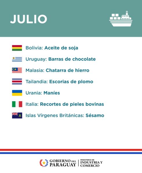 De acuerdo a datos de la Dirección de Inteligencia de la Red de Inversiones y Exportaciones (Rediex), entre los principales embarques realizados en el mes de julio, se destacan el aceite de soja enviado a Bolivia por valor de USD 72.000; barras de chocolate a Uruguay, por USD 94.727; y escorias de plomo a Tailandia, por USD 156.210. También se registraron exportaciones de sésamo a las Islas Vírgenes Británicas, maníes a Ucrania, y recortes de pieles bovinas a Italia, entre otros.