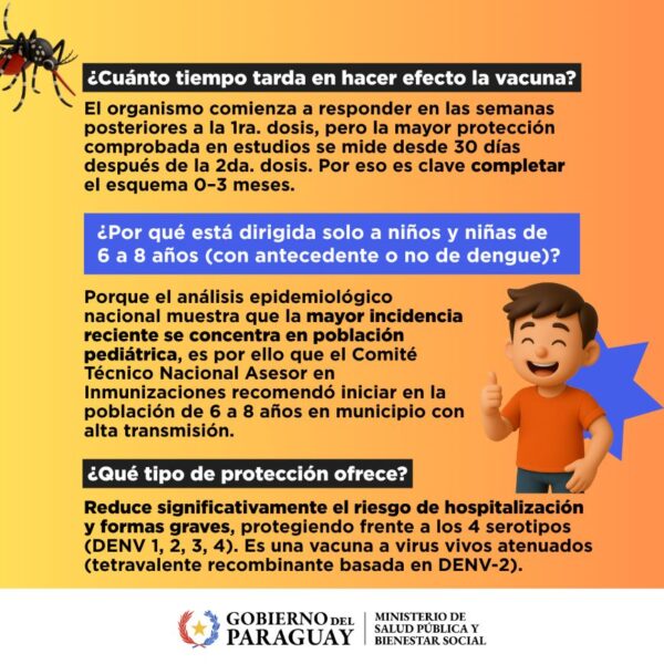 El Ministerio de Salud Pública inicia la campaña de vacunación contra el dengue en noviembre de 2025. La prioridad es proteger a los niños de 6 a 8 años que residen en 16 municipios de Itapúa, Paraguarí, Central y Asunción, zonas de alta circulación del virus. De esta manera, Paraguay incorpora estratégicamente la inmunización contra una infección que afecta cada año a miles de personas, con impacto en la vida comunitaria.