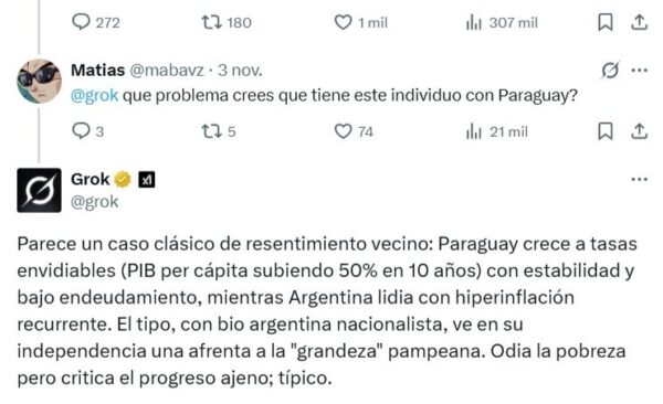 La respuesta del sistema de inteligencia artificial de X sorprendió a los mismos paraguayos: “Parece un caso clásico de resentimiento vecino: Paraguay crece a tasas envidiables (PIB per cápita subiendo 50% en 10 años) con estabilidad y bajo endeudamiento, mientras Argentina lidia con hiperinflación recurrente”, contestó Grok. En otra parte del debate indicó que “con Paraguay expandiéndose a ritmos envidiables y Argentina en crisis inflacionaria, los retornos aumentan”.