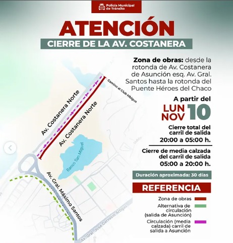 Desde este lunes 10 de noviembre de 2025, el Ministerio de Obras Públicas y Comunicaciones (MOPC) y la Administración Nacional de Electricidad (ANDE) iniciaron trabajos de instalación de conexiones subterráneas en un tramo de la Costanera Norte de Asunción. Por esta razón, se cerrará parcialmente un carril de salida por un periodo de 30 días.