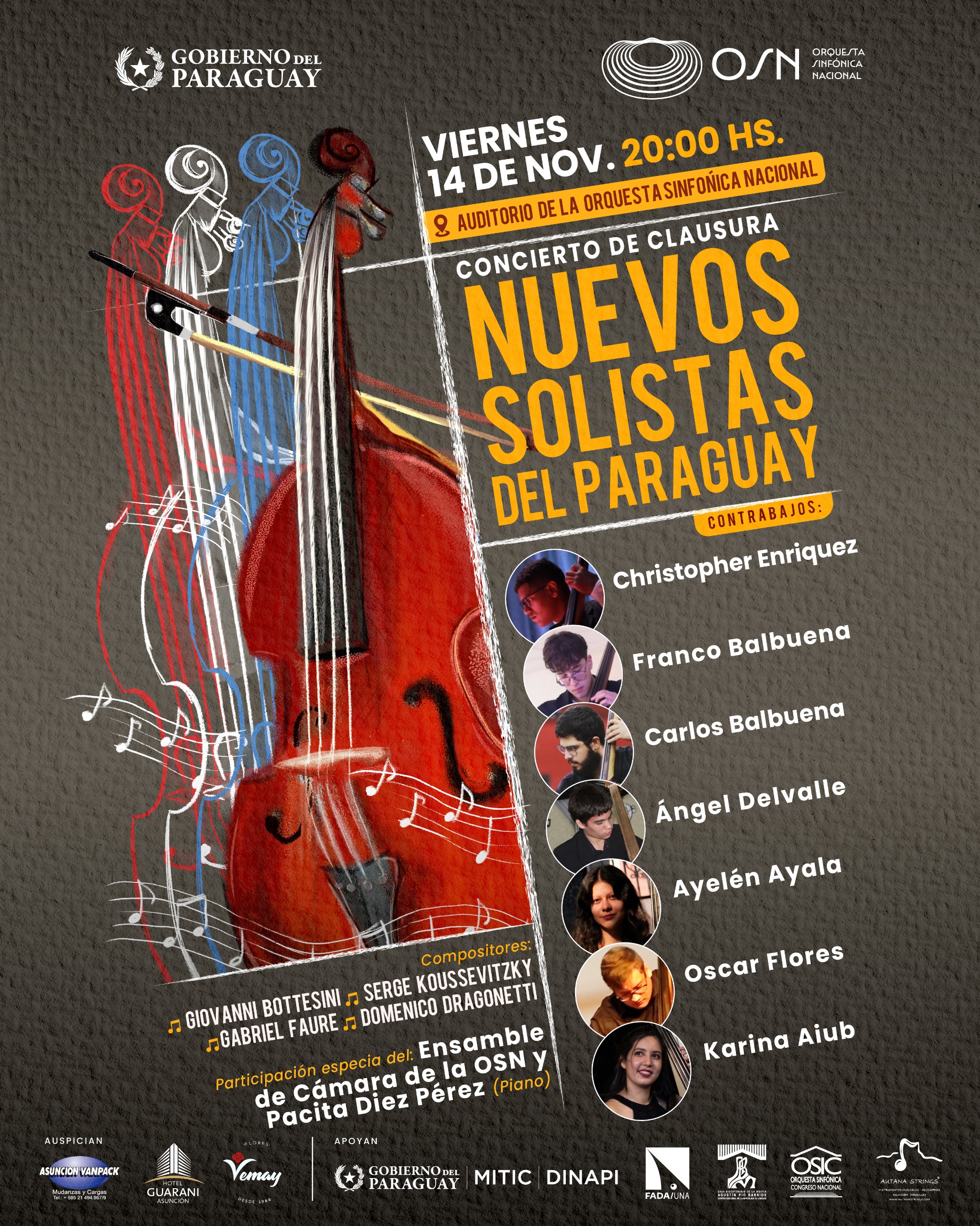 El festival de Clausura se denomina “Nuevos Solistas del Paraguay” con talentosos intérpretes que presentarán obras de Bottesini, Koussevitzky, Fauré y Dragonetti, junto al Ensamble de Cámara de la OSN y Pacita Diez Pérez en el piano.