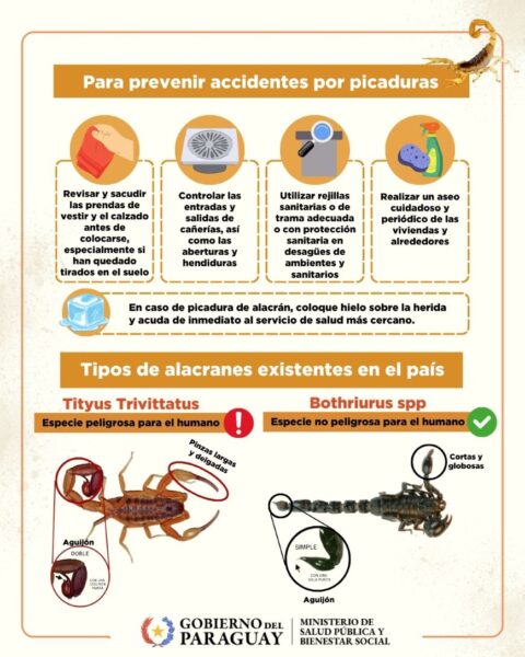 La “temporada” de alacranes inició en Paraguay. Las temperaturas altas hacen que busquen refugio y las consultas por picaduras de este arácnido son cada vez más frecuentes en el país. En este marco, el Ministerio de Salud insta a la población a tomar medidas inmediatas, como aplicar hielo sobre la herida y acudir de inmediato al servicio de salud, ya que en el país se dispone del antiveneno para escorpiones de importancia médica.
