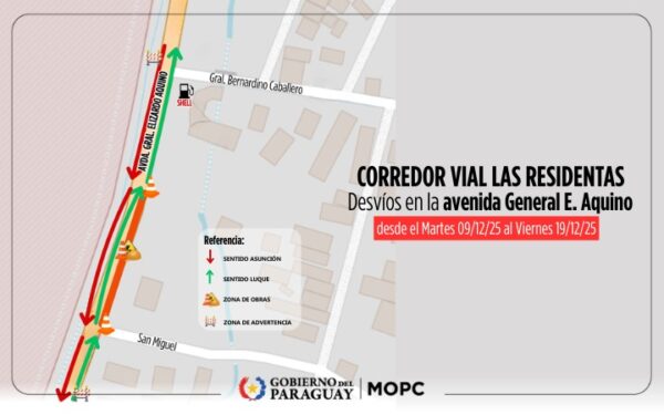 El Ministerio de Obras Públicas y Comunicaciones anunció que el desvío estará activo hasta este viernes 19 de diciembre, en el tramo comprendido entre las calles Gral. Bernardino Caballero y San Miguel. Sin embargo, el tránsito se mantiene habilitado, sin cortes, sobre la avenida Elizardo Aquino.