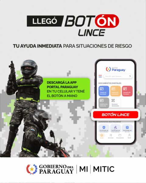 El Botón Lince, integrado en la aplicación del Portal Paraguay, permite a cualquier ciudadano con Identidad Electrónica solicitar ayuda policial con un solo toque. Gracias a la georreferenciación automática de la ubicación del pedido de auxilio, la intervención policial se agiliza notablemente, con un tiempo promedio de llegada estimado en solo cuatro minutos.