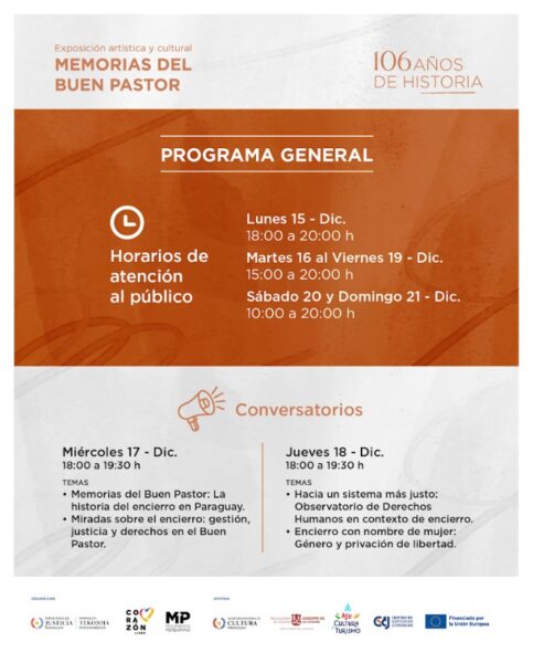 La muestra “Memorias del Buen Pastor: 106 años de historia”, se inaugura en la fecha -15 de diciembre- y se extiende hasta al domingo 21 de diciembre, hasta las 20 hs, para que la ciudadanía pueda recorrer el excentro penitenciario. La entrada es libre y gratuita. La organización está a cargo del Ministerio de Justicia y el Proyecto Social Corazón Libre del Movimiento Peregrino, con apoyo de la Secretaría Nacional de Cultura, Municipalidad de Asunción, el Centro de Estudios Judiciales y con financiación de la Unión Europea.