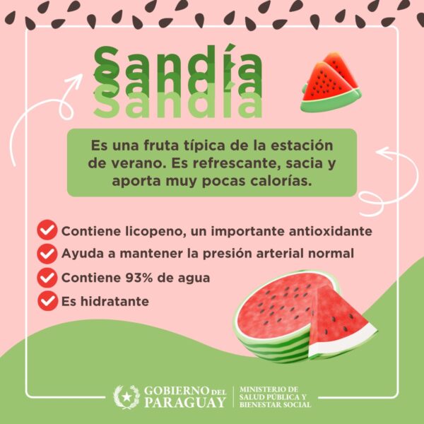 En este marco, profesionales del Ministerio de Salud recuerdan las importantes propiedades de la fruta típica de esta estación, que sacia. La sandía contiene aproximadamente 93% de agua y aporta vitaminas y minerales. Es una fuente importante de licopeno –contiene 1,5 veces más que los tomates-, un poderoso antioxidante que le da su color rojo y que supera en cantidad a muchas otras frutas frescas como el tomate, protegiendo contra enfermedades cardíacas y ciertos tipos de cáncer.
