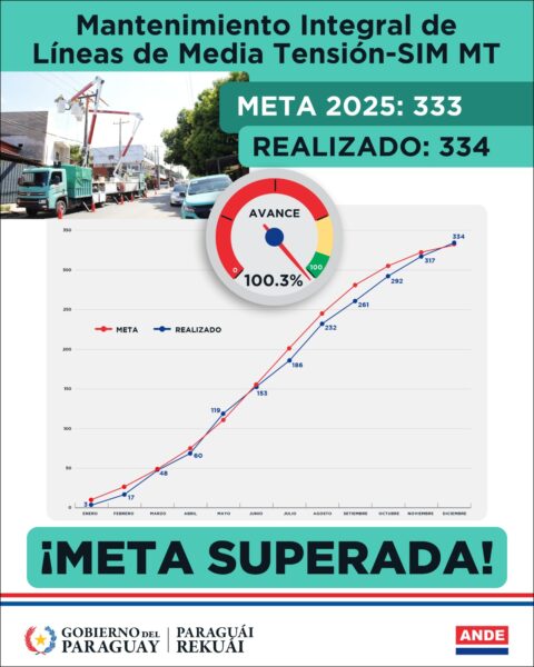 “¡Meta superada!”, publica la Ande en sus redes sociales. Hoy los usuarios de media tensión, correspondiente a 23 kV, pueden confiar en un verano con suministro eléctrico, más allá de lo que indique el termómetro. A través de la implementación del Sistema Integral de Mantenimiento, con datos previamente relevados, 100 % georeferenciados, sistematizado y planificado para su ejecución, se logró completar el mantenimiento preventivo integral.