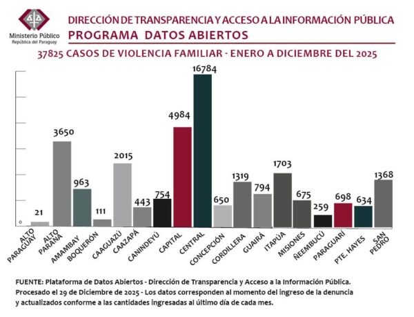 Durante el año 2025, el Ministerio Público registra un total de 37 casos de feminicidios en Paraguay, lo que dejó 69 huérfanos. Además, la Fiscalía atendió un total de 37.825 víctimas de violencia familiar este año, lo que implica un promedio de 104 víctimas por día.