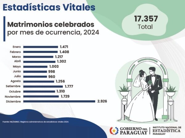 Los matrimonios también destacaron, con un total de 17.357 uniones celebradas durante el año. Diciembre fue el mes estrella, con 2.926 matrimonios, duplicando el promedio mensual y confirmando la tradición de cierres festivos.