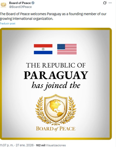 El Board of Peace, la nueva organización internacional impulsada por el presidente de Estados Unidos, Donald Trump, dio la bienvenida oficial a Paraguay como miembro fundador a través de su cuenta en X (Twitter). En el post compartido este 27 de enero de 2026, la entidad destaca el ingreso de Paraguay a esta iniciativa que busca promover la paz global, con foco inicial en la reconstrucción de Gaza.
