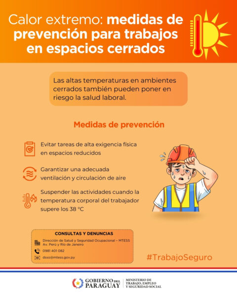 Ante el pronóstico de días de intenso calor en Paraguay, el Ministerio de Trabajo, Empleo y Seguridad Social (MTESS) lanzó una campaña de recomendaciones para prevenir el estrés térmico, golpes de calor y otros riesgos en trabajadores expuestos a altas temperaturas, tanto al aire libre como en espacios cerrados.