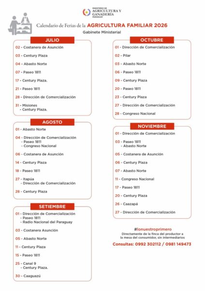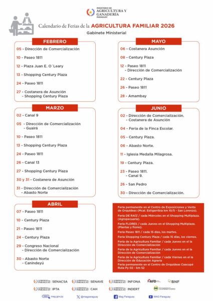 con frecuencia de 3 a 5 veces por semana en todo el territorio nacional, gestionado por la Dirección de Extensión Agraria (DEAG) en 184 distritos, la Dirección de Comercialización (DC) y la Coordinación de Ferias y Exposiciones. Estas actividades se realizan en puntos estratégicos como la Costanera de Asunción y cabeceras departamentales, promoviendo circuitos cortos de comercialización.