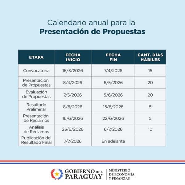 Las solicitudes podrán presentarse en la Mesa Central de Entradas del MEF, del 8 de abril al 6 de mayo de 2026, mediante el formulario Anexo B-01-09 A https://www.mef.gov.py/es/marco-legal/ley-de-presupuesto/formularios-anexo-b-2026 Cada propuesta recibirá un número de expediente para su seguimiento.