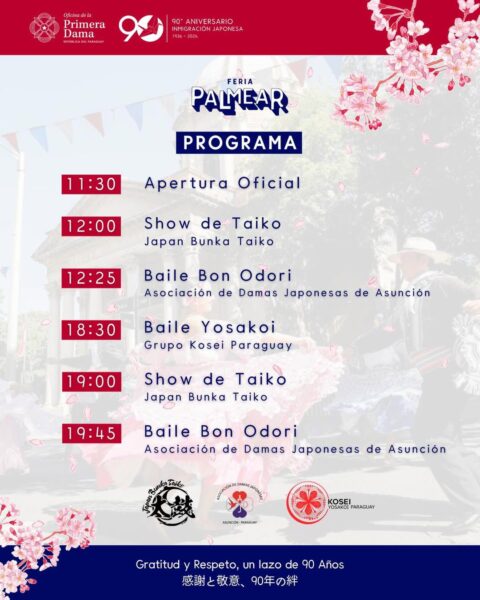 Presentaciones artísticas destacadas incluirán espectáculos de Taiko (tambores japoneses), Bon Odori (danza tradicional) y Yosakoi (danza moderna), a cargo de agrupaciones de la comunidad japonesa en Paraguay. La feria integrará feriantes y emprendedores locales, fomentando espacios de encuentro ciudadano y activación cultural en el corazón de la capital.