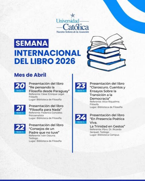 La Universidad Católica Nuestra Señora de la Asunción organiza la “Semana Internacional del Libro 2026”, que se extiende hasta el 24 de abril en las bibliotecas de esta casa de estudios, como un espacio de reflexión y encuentro a través de la lectura. El 23 de abril, la actividad será en la biblioteca de la Facultad de Filosofía; se presentará el texto “Claroscuro. Cuentos y ensayos sobre la transición a la democracia”.