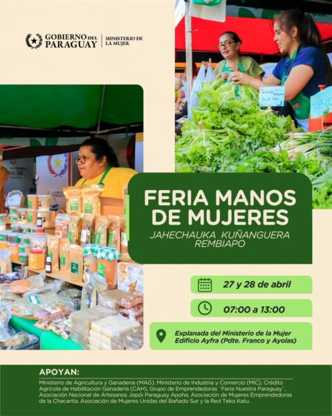 El Ministerio de la Mujer organiza la Feria “Manos de Mujeres – Jahechauka: Kuñanguéra Rembiapo”, un espacio dedicado a resaltar el esfuerzo de emprendedoras paraguayas. El evento se realizará el lunes 27 y martes 28 de abril, de 07:00 a 13:00 horas, en la explanada del ministerio, ubicada en el centro de Asunción.