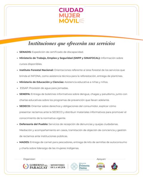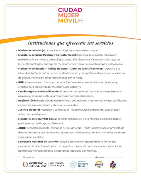 Ciudad Mujer Móvil es una iniciativa impulsada por el Gobierno del Paraguay, a través del Ministerio de la Mujer y con el apoyo de la Oficina de la Primera Dama, que busca acercar el Estado al territorio, facilitando el acceso a derechos y servicios esenciales, especialmente para las mujeres.