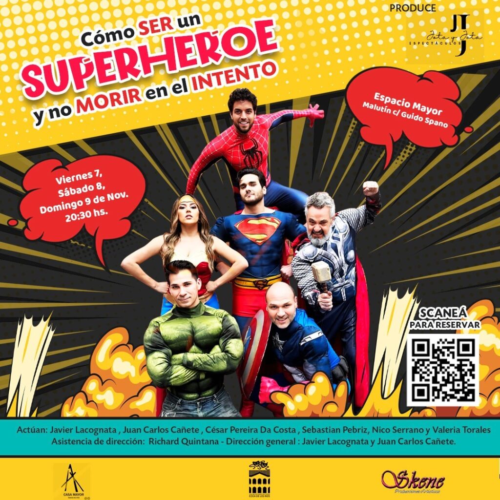 Llega el show más divertido, irreverente y honesto sobre el universo masculino: “Cómo ser un superhéroe y no morir en el intento”, un show de café concert explosivo donde cinco hombres se atreven a confesar —con copa en mano— todo lo que las mujeres siempre quisieron saber y que ellos nunca se animaron a decir. La obra ofrece una mirada cómplice, desopilante y tierna sobre el amor, el sexo, el ego masculino y los pequeños desastres cotidianos de los “héroes” de la vida real. Entre carcajadas, música y situaciones delirantes, el público podrá conocer a un Hulk con deudas, a un Superman que a veces se queda sin aire, a un Thor con martillo flojo, al Hombre Araña estrellado y un Capitán Sudamérica que suda hasta el alma. Con humor, ironía y confesiones sin filtro, el show es una invitación a disfrutar con humor de las situaciones que atraviesan muchos hombres. La dirección general de la obra está a cargo de Javier Lacognata y Juan Carlos Cañete, y el elenco está conformado por Javier Lacognata, Juan Carlos Cañete, César Pereira Da Costa, Sebastian Pebriz, y Nico Serrano, con la participación especial y coreografía de Valeria Torales. Las funciones serán este viernes 7, sábado 8 y domingo 9 de noviembre, a las 20:30, en el Espacio Mayor, sito en Malutín casi Guido Spano, del barrio Villamorra de Asunción. El costo de entradas es de G 100.000, y G 85.000 en forma anticipadas.