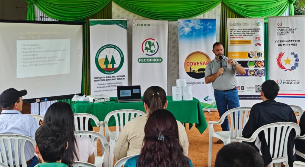 El Ministerio de Industria y Comercio y la Federación de Cooperativas de Producción, Fecoprod, capacitaron a productores lácteos en el distrito de Itacurubí del Rosario, del departamento de San Pedro. El objetivo fue prepararlos para la incorporación de tecnologías actualizadas y procesos estandarizados que permitan fortalecer este sector clave de la economía local, mejorarando la calidad de sus productos y su competitividad en el mercado. La capacitación se desarrolló en el marco del Proyecto KESOPY, una iniciativa orientada a modernizar la cadena de producción del queso Paraguay llevando la producción artesanal a un desarrollo más formal, estandarizado y competitivo, para ampliar las oportunidades de comercialización. Estudiantes de bachilleratos técnicos agropecuarios y productores lecheros fortalecieron así sus capacidades técnicas en la elaboración de productos lácteos, promoviendo buenas prácticas, innovación y mejora continua dentro de la cadena de valor. La iniciativa cuenta a su vez con el apoyo del Proyecto FOMIPYMES, que busca mejorar la calidad de la producción textil y láctea, con la ayuda de la tecnología y el conocimiento, el MIC y la República de China (Taiwán), una iniciativa conjunta entre el Ministerio de Industria y Comercio (MIC) y la Misión Técnica de Taiwán, que trabaja en el fortalecimiento de las habilidades empresariales en sectores seleccionados. También contempla la ayuda a las Mipymes en el acceso a financiamiento, con programas y herramientas que faciliten el acceso a créditos, microcréditos y otras formas de financiamiento, así como acuerdos entre el Viceministerio de Mipymes con instituciones financieras. A través del cooperativismo, estas iniciativas impulsan la economía de más familias en San Pedro, generando oportunidades de crecimiento, fortaleciendo el arraigo local y promoviendo el desarrollo sostenible en las comunidades rurales. En el marco de la capacitación también se realizó la entrega de certificados a las mujeres productoras de la Cooperativa Carolina Ltda., quienes culminaron satisfactoriamente su proceso de formación de desarrollo productivo y mejora de la calidad de productos lácteos. Estas acciones forman parte de un trabajo articulado entre instituciones públicas, organismos de cooperación y actores del sector productivo, orientado a promover el desarrollo sostenible de la cadena láctea y generar mayores oportunidades para los productores de la región.