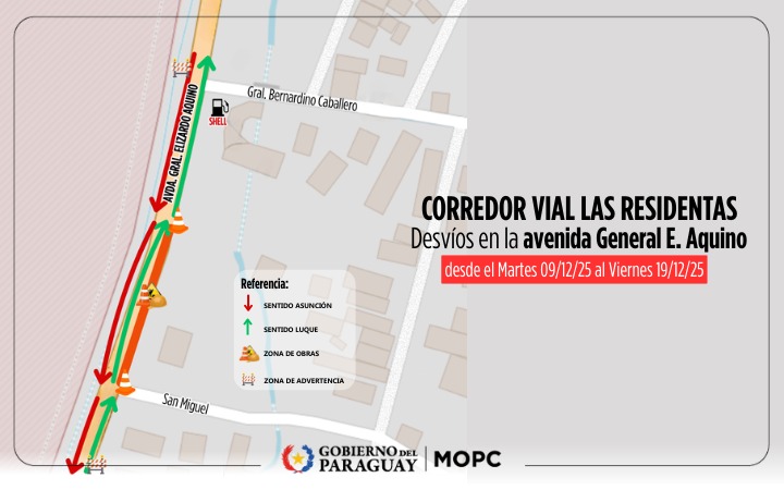 El MOPC puso en marcha un esquema de circulación temporal sobre la avenida Elizardo Aquino o “Tape Tujá”, el antiguo acceso a la ciudad de Luque, en el marco de la construcción del Corredor Vial Las Residentas. El objetivo es complementar las obras del superviaducto y solucionar el cuello de botella que se forma en la zona, lo que impactará en una circulación más fluida y en el mejoramiento de la calidad de vida de miles de personas que se desplazan cada día entre Asunción y el cono urbano. El Ministerio de Obras Públicas y Comunicaciones anunció que el desvío estará activo hasta este viernes 19 de diciembre, en el tramo comprendido entre las calles Gral. Bernardino Caballero y San Miguel. Sin embargo, el tránsito se mantiene habilitado, sin cortes, sobre la avenida Elizardo Aquino. Hay un recorrido guiado en ambos sentidos, que inicia con una zona de advertencia y continúa con un desplazamiento gradual hacia la banquina en el sentido Luque-Asunción y finaliza con el retorno al carril habitual. La configuración responde a las necesidades del frente de obra y permite seguir trabajando sin interrumpir el flujo vehicular, con la señalización pertinente para orientar a los conductores. El proyecto del Corredor Vial Las Residentas continúa avanzando con obras de duplicación de calzadas, mejoras de drenaje y otras tareas complementarias a lo largo del tramo que une Las Residentas con la avenida Sudamericana, contribuyendo a mejorar la movilidad y la seguridad en este corredor que conecta Luque y Asunción. El Corredor Vial Las Residentas fortalecerá la conexión entre Luque y Asunción, facilitando una circulación más ágil y segura, mediante la duplicación de calzadas y la optimización de intersecciones clave. Las obras del Corredor Vial Las Residentas están a cargo de la empresa Benito Roggio e Hijos S.A. ejecuta bajo la supervisión del MOPC.