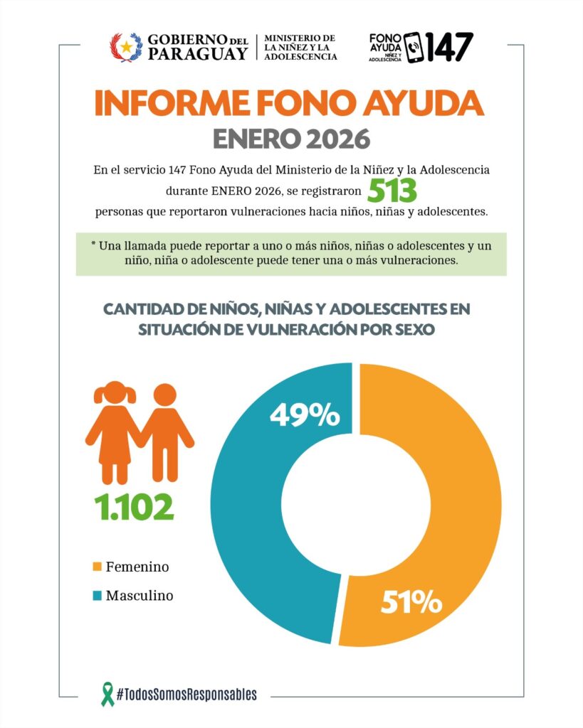El Ministerio de la Niñez y la Adolescencia (MINA) publicó el primer informe de Fono Ayuda del 2026, revelando que enero registró 1.102 niños, niñas y adolescentes en situación de vulnerabilidad. Estos datos provienen de 513 llamadas a la línea gratuita 147, que reportaron un total de 1.313 vulneraciones de derechos. El maltrato infantil lidera las denuncias con 360 casos, seguido por la falta del deber de cuidado con 456 reportes. La situación de calle suma 144 casos, a menudo ligada a explotación laboral o trabajo infantil, pero limitada a menores sin referente adulto o que rechazan volver a casa. Otras vulneraciones graves incluyen 110 denuncias de abuso sexual y 9 de explotación sexual. Un dato alarmante es que 5 niños y niñas quedaron huérfanos por feminicidio solo en enero. Cada llamada puede reportar múltiples casos, como el ejemplo de tres hermanos víctimas de maltrato, explotación laboral y negligencia paterna. Respuesta inmediata y derivaciones Todas las denuncias se derivan al Sistema jurisdiccional. Los #ChalecosRojos, equipos del Dispositivo de Respuesta Inmediata, ofrecen apoyo y seguimiento según cada necesidad. Fono Ayuda no solo asesora y contiene emocionalmente, sino que conecta con la Policía Nacional, el Ministerio Público y la Defensa Pública para una intervención integral. La protección infantil es responsabilidad compartida. Si detectás violencia, llamá al 147 (Fono Ayuda), 911 (Policía) o 133 (Defensa Pública). No calles.