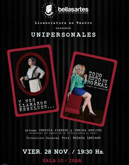El Instituto Superior de Bellas Artes (ISBA) presenta este viernes 28 de noviembre a las 19:30 horas dos obras unipersonales de teatro feminista, realizadas por las alumnas del segundo año de la Licenciatura en Teatro. La cita es en la sala 15 del ISBA, bajo la dirección general de la profesora Roxana Lescano. Las obras serán interpretadas por Jessyca Jiménez y Yemina Benítez y abordan temas relacionados con los obstáculos que enfrentan las mujeres en la sociedad. Y nos llamaron rebeldes…, de Jessyca Jiménez, narra la vida de la figura histórica paraguaya Serafina Dávalos y su lucha por la igualdad de género y el acceso a la educación en un contexto de rechazo y acoso. Por su parte, Todo esto es normal según la encuesta, de Yemina Benítez, es una parodia tragicómica que refleja la violencia contra las mujeres y cómo muchas veces esos abusos son normalizados en la sociedad. El equipo creativo incluye además al profesor Miguel Rodas en la coreografía teatral, Jazmín Bello en sonido, Roberto González en iluminación y el profesor Dani González en edición, complementando esta única función que promete una profunda reflexión social. Muestra Poesía Imaginada, la muestra artística que fusiona artes visuales y literarias, tendrá su segunda edición el mismo día 28 de noviembre a las 18:30 horas en la sede de Turista Róga de la Secretaría Nacional de Turismo (Senatur), con entrada libre y gratuita. La exposición presenta 21 obras visuales creadas por estudiantes de Artes Visuales inspiradas en 21 poemas de alumnos de la Escuela de Artes Literarias “Josefina Plá” del ISBA, generando un diálogo entre palabra y imagen que invita a nuevas lecturas visuales de la poesía. La profesora Estela Kobs, coordinadora de la escuela literaria, explica que la muestra busca explorar cómo un poema puede sugerir formas y emociones, y cómo el dibujo puede dialogar y resignificar la palabra para revelar sentidos inesperados, creando un hilo narrativo colectivo entre dos lenguajes artísticos.