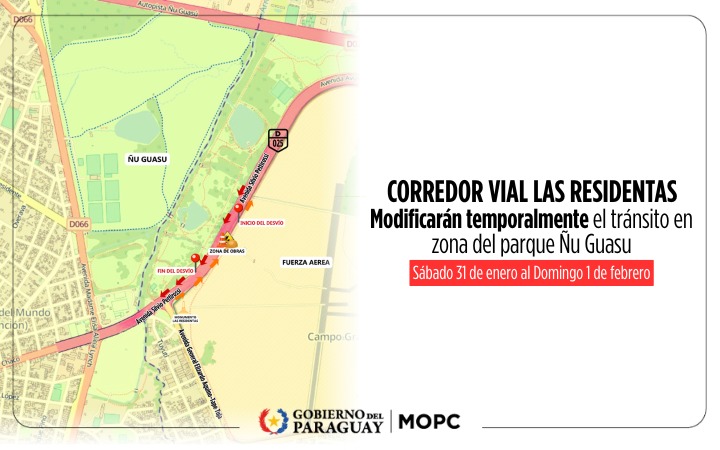 El Ministerio de Obras Públicas y Comunicaciones (MOPC) anunció modificaciones temporales en el tránsito de la autopista Silvio Pettirossi, a la altura del parque Ñu Guasu, este sábado 31 de enero y domingo 1 de febrero. La medida responde a trabajos de pilotes para el viaducto del Corredor Vial Las Residentas. Las intervenciones se realizarán de 06:00 a 18:00 ambos días. A partir de las 18:00, el tránsito volverá a la normalidad. Sentido afectado: Luque–Asunción, interrumpido en el sector del parque Ñu Guasu. Desvío: Los vehículos serán redirigidos al carril contrario (Asunción–Luque), que funcionará como doble vía por unos 400 metros. Control del flujo: Se dispondrá de señalización vertical, canalizadores y personal banderillero para guiar a los conductores. Retorno a carril habitual: Una vez superada la zona de obras, se podrá continuar normalmente. El MOPC recomienda reducir la velocidad, respetar las indicaciones del personal y circular con precaución por la presencia de maquinaria pesada. Estas obras forman parte del Corredor Vial Las Residentas, que incluye duplicación de calzada, mejora del drenaje y mayor conectividad en el área metropolitana. Los trabajos los ejecuta Benito Roggio e Hijos S.A., con financiamiento de la Fundación Parque Tecnológico Itaipú – Paraguay (FPTI-PY) y supervisión del MOPC.