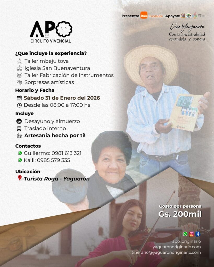 El Circuito Vivencial APO, Yaguarón Originario abre sus puertas este sábado 31 de enero para invitar a paraguayos y visitantes a sumergirse en los saberes ancestrales que perduran en el corazón de Yaguarón. Esta experiencia única busca preservar la riqueza cultural del territorio a través de patrimonios vivos, impulsando al mismo tiempo la economía local. El evento integra tres ejes principales: artesanía, naturaleza y música ancestral, complementados con expresiones artísticas y degustaciones de comidas típicas. Los participantes disfrutarán de talleres participativos como la técnica cerámica del ñai’upo para elaborar mbeju tova, y la demostración de fabricación de instrumentos de la Banda Peteke Peteke. Todo ello en una jornada completa, de 08:00 a 16:00, en el centro histórico de Yaguarón. Impulsado por una investigación antropológica liderada por Claudilene Saldívar, conocida como Kalil, el proyecto cuenta con el respaldo de la Fundación Itaú, el apoyo de la Municipalidad local y el reconocimiento como interés cultural por la Secretaría Nacional de Cultura. «Es una oportunidad para conectar con nuestras raíces y fortalecer el bienestar social de la comunidad», destacan los organizadores. El costo es accesible: Gs. 200.000 por persona, e incluye traslado interno, gastronomía, taller de artesanía, animación artística y guiatura profesional. Apto para todo público, desde familias hasta amantes de la cultura.