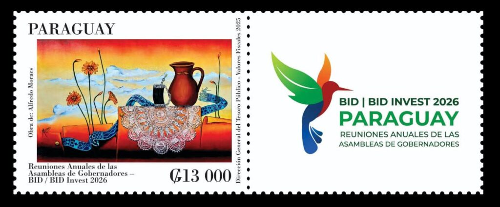 La Dirección Nacional de Correos del Paraguay (Dinacopa), mediante su Asesoría Filatélica, pone en circulación la emisión postal titulada “Reuniones Anuales de las Asambleas de Gobernadores BID/BID Invest 2026”. Con anticipación al evento oficial que se llevará a cabo en Paraguay del 11 al 14 de marzo de 2026, Dinacopa presenta estas estampillas que rinden homenaje al Banco Interamericano de Desarrollo. Los timbres postales exhiben la obra del artista plástico Alfredo Moraes, “Tradición Paraguaya”, que representa símbolos esenciales de la identidad nacional: la guampa, elaborada con cuerno de vaca y detalles en plata; y la jarra de cerámica de barro cocido utilizada para mantener fresca el agua del tereré. Ambos recipientes están sobre un tejido de encaje ñandutí adornado con flores que evocan la riqueza natural paraguaya. Se imprimieron 3.000 unidades de estas estampillas, cada una con un valor de G. 13.000, disponibles para los usuarios. La emisión fue autorizada por el Decreto Ejecutivo Nº 4214 del 14 de julio de 2025. Esta colección filatélica destaca la cultura paraguaya y celebra la importancia del encuentro internacional que posiciona al país como sede de las reuniones del BID.