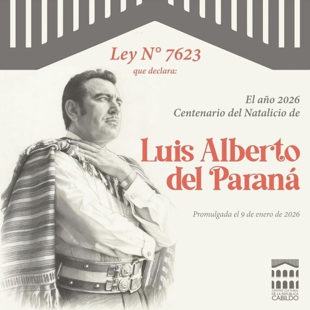 El Centro Cultural de la República El Cabildo celebra con orgullo la promulgación de la Ley N° 7623, mediante la cual el Congreso de la Nación declara el 2026 como “Año del Centenario del Natalicio de Luis Alberto del Paraná”. Esta distinción rinde homenaje a la legendaria trayectoria del artista que llevó la música paraguaya a los escenarios más importantes del mundo. Luis Alberto del Paraná, ícono de la guitarra y la voz paraguaya, se convirtió en un embajador universal de nuestra cultura. Con su talento, proyectó con dignidad el alma del Paraguay, especialmente a través del Trío “Los Paraguayos”, llevando nuestra tradición musical a rincones lejanos. La nueva ley impulsa acciones simbólicas y patrimoniales para perpetuar su legado, como la erección de un monumento en su memoria, la denominación de espacios públicos y promociones educativas con su nombre, la emisión de piezas conmemorativas, un homenaje a los integrantes del Trío “Los Paraguayos”, la construcción de un museo dedicado a su obra y la difusión sostenida de su música en medios de comunicación durante todo 2026. El Cabildo reafirma su compromiso con la preservación del patrimonio cultural paraguayo, promoviendo la memoria histórica y la identidad nacional. Esta declaración es un acto de justicia cultural que invita a las nuevas generaciones a inspirarse en un artista que unió Paraguay con el mundo a través del arte.