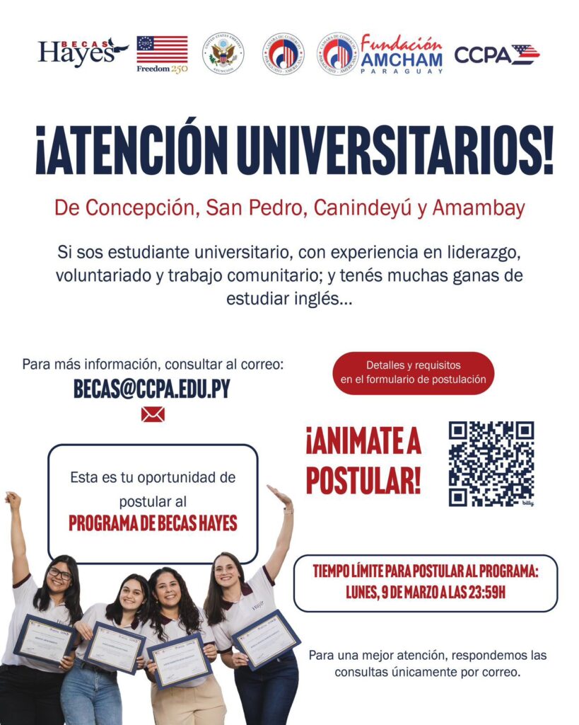 Jóvenes universitarios de Concepción, San Pedro, Canindeyú y Amambay tienen hasta el 9 de marzo para postularse a las Becas Hayes en modalidad virtual, una oportunidad para estudiar inglés de forma interactiva y gratuita, enfocada en temas juveniles y la cultura estadounidense. La iniciativa, promovida por el Centro Cultural Paraguayo Americano (CCPA), ofrece una metodología comunicativa que conecta a los participantes con contenidos relevantes para su edad, fomentando el dominio del idioma inglés sin necesidad de desplazamientos. Requisitos y cómo postularse Las postulaciones permanecen abiertas hasta el 9 de marzo de 2026, dirigida exclusivamente a universitarios residentes en las regiones mencionadas. . Para acceder al formulario e información completa, visita https://forms.gle/iovZHpeeCtYXafWd7. Cualquier consulta puede enviarse a becas@ccpa.edu.py. Esta beca representa una puerta de acceso a herramientas lingüísticas clave para el desarrollo profesional y personal, especialmente en zonas del interior. Los interesados deben apurarse, ya que las plazas son limitadas.