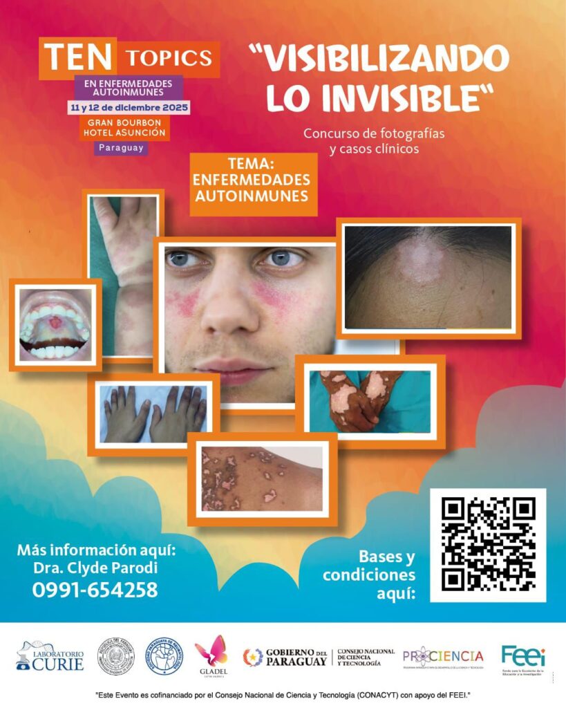 La Facultad de Ciencias Médicas de la Universidad Nacional de Asunción, a través de la Maestría en Enfermedades Autoinmunes y el Laboratorio Curie, lanzó el concurso de fotografía “Visibilizando lo Invisible”, dirigido a la comunidad médica, científica y estudiantes de medicina. La iniciativa busca abordar los casos clínicos en el marco del congreso Ten Topics en Enfermedades Autoinmunes, a realizarse el 11 y 12 de diciembre de 2025, con expertos de Europa y Latinoamérica. “Será un evento científico de alto nivel que abordará los temas más relevantes y actuales en el estudio y tratamiento de las enfermedades autoinmunes”, resaltó la Prof. Dra. María Isabel Acosta, coordinadora general de la Maestría en Enfermedades Autoinmunes. El encuentro se realizará en el Gran Bourbon Hotel Asunción, Paraguay, desde las 10:00 horas, en las dos jornadas, 11 y 12 de diciembre. El objetivo del concurso es destacar la manifestación clínica y la diversidad de estas patologías, a través del arte fotográfico y la descripción de casos, promoviendo una mayor conciencia y comprensión de las enfermedades autoinmunes. La fecha límite para la presentación de trabajos fotográficos es el 30 de noviembre de 2025. Las bases y condiciones están disponibles a través del enlace: https://short.do/Kb_YjT Las obras se expondrán en el marco de la actualización científica, propiciada en el encuentro que está cofinanciado por el Consejo Nacional de Ciencia y Tecnología (CONACYT), con apoyo del Fondo para la Excelencia de la Educación y la Investigación (FEEI). Además, cuenta con el respaldo de instituciones clave como el Grupo Latinoamericano de Estudio del Lupus (GLADEL), la Sociedad Paraguaya de Reumatología, el Dpto. de Reumatología de la FCM-UNA, reafirmando el compromiso con el avance científico y la formación de capital humano calificado en el país. Inscripciones al evento https://short.do/5JT6iY