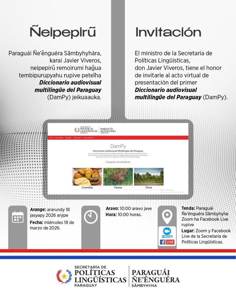 La Secretaría de Políticas Lingüísticas (SPL) presentará este miércoles 18 de marzo el Diccionario audiovisual multilingüe del Paraguay (DamPy), una innovadora plataforma digital que recopila, organiza y difunde el rico patrimonio lingüístico del país. En su primera fase, incluye cuatro idiomas: castellano, guaraní, mbya y lengua de señas paraguaya. El lanzamiento se realizará de forma virtual a las 10:00, a través de Zoom y Facebook Live de la Secretaría de Políticas Lingüísticas. Desarrollada con la colaboración de la docente Estela Peralta, de la Universidad Autónoma de Asunción (AAU), esta herramienta lexicográfica se estructura en campos semánticos como fauna, flora y gastronomía. Su objetivo es promover el acceso equitativo al conocimiento, facilitar el aprendizaje y valorar las lenguas que definen la identidad cultural paraguaya. Tras el lanzamiento, el DamPy estará disponible de manera libre y gratuita en la web institucional de la SPL: www.spl.gov.py. Esta iniciativa representa un avance en el trabajo lexicográfico regional, incorporando imagen, sonido y gesto como elementos clave para registrar y representar el léxico, superando los métodos tradicionales.