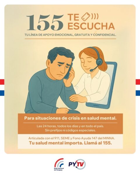 “Si vos o alguien que conocés está pasando por un momento difícil, recordá que no estás solo/a”. Con este mensaje, Salud recuerda a la población que está disponible la línea 155, gratuita y confidencial, para acceder a asistencia profesional inmediata en momentos de crisis emocionales. “Hablemos de salud mental, busquemos ayuda y acompañemos”, es el mensaje que difunde, en una época cuando las crisis de salud mental hacen eclosión. El servicio es accesible desde cualquier línea telefónica o compañía celular en todo el territorio nacional, sin necesidad de prefijo o numeral adicional. Simplemente marcando 155, las personas van a encontrar a un profesional capacitado para escucharlas y orientarlas, incluyendo psicólogos y psiquiatras. El servicio de llamada funciona las 24 horas y está articulado con otros servicios de emergencia, como el 911 y el SEME, para garantizar una atención integral y efectiva. También con el servicio de Fono Ayuda 147 del Ministerio de la Niñez y la Adolescencia. La Línea brinda contención emocional, intervención en crisis y orientación oportuna a personas que enfrentan situaciones de sufrimiento psíquico, riesgo suicida o necesidad urgente de apoyo psicológico. Algunos de los tipos de llamadas esperadas incluyen crisis suicidas, episodios de ansiedad y pánico, situaciones de violencia y abuso y orientación en salud mental para personas y familiares. Además, el Ministerio de Salud Pública pone a disposición un directorio online con la base de datos de psicólogos y psiquiatras por región sanitaria, permitiendo a las personas y familias encontrar atención especializada de forma accesible. Ingresar AQUÍ.